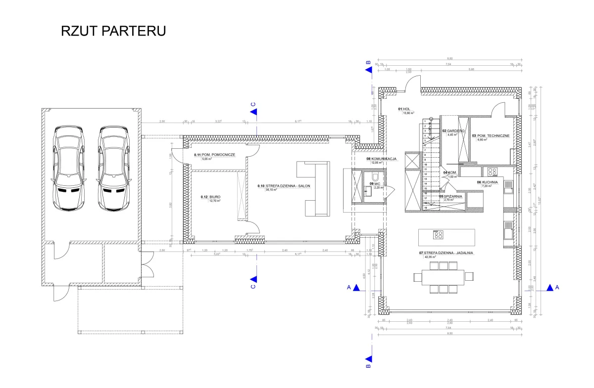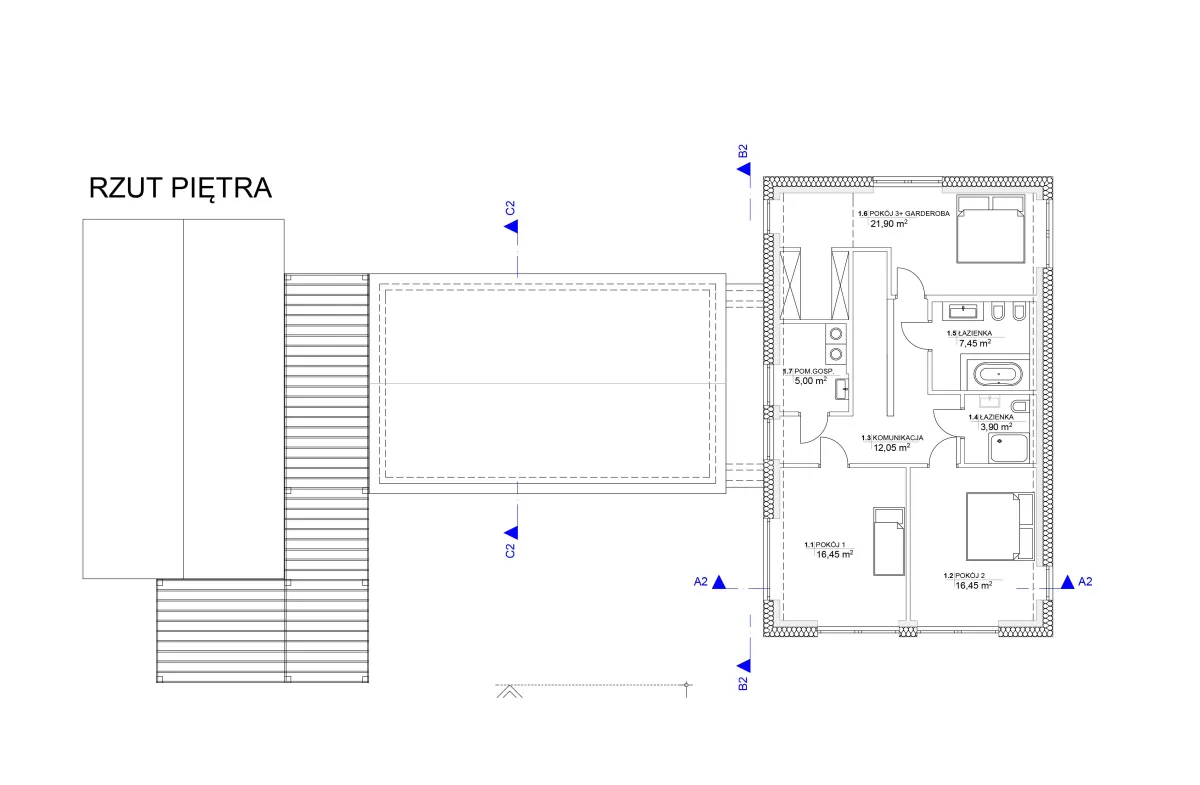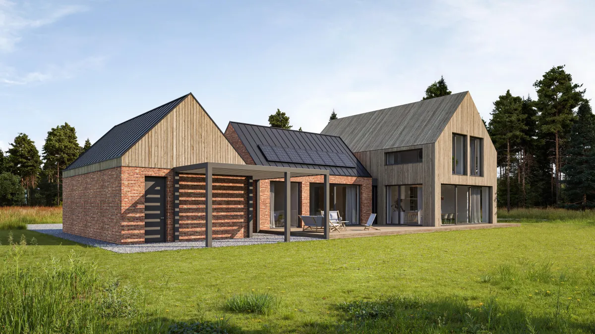 Zaprojektowałam budynek w formie nowoczesnej stodoły, z wyraźnym podziałem na strefę dzienną i nocną oraz z garażem połączonym pergolą, która spaja całość i tworzy półprywatną przestrzeń pomiędzy bryłami.